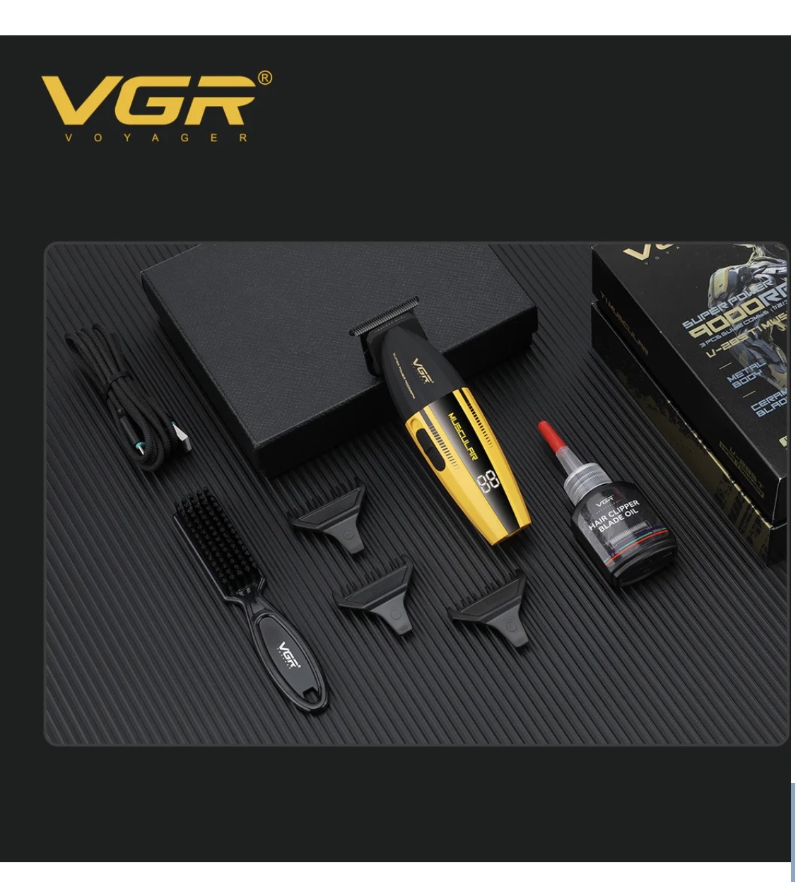 ماكينة VGR MUSCULAR V-285 الاحترافية بموتور قوي سرعة 9000 لفة في الدقيقة، تديك تحديد دقيق وفيد نظيف بدون شد. شفرة سيراميك حادة، جسم معدني متين، وشاشة ديجيتال لعرض البطارية، مع 3 أمشاط مختلفة المقاسات – اختيار مثالي للحلاقين وللي عايز نتيجة صالون في البيت 💈🔥